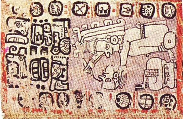 aus dem Mayacodex Madrid. Auf der linken Seite, die 2. Glyphe in der 2.Reihe (wenn das Bild um 90 Grad