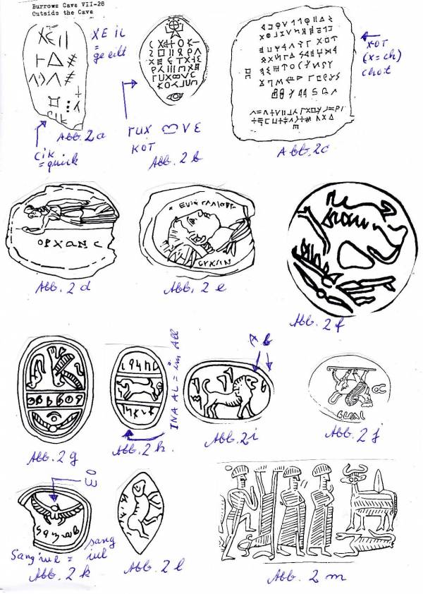 Die Abb. 2a, b und c zeigen uns die sogenannte Burrows-Cave-Schrift, die ich