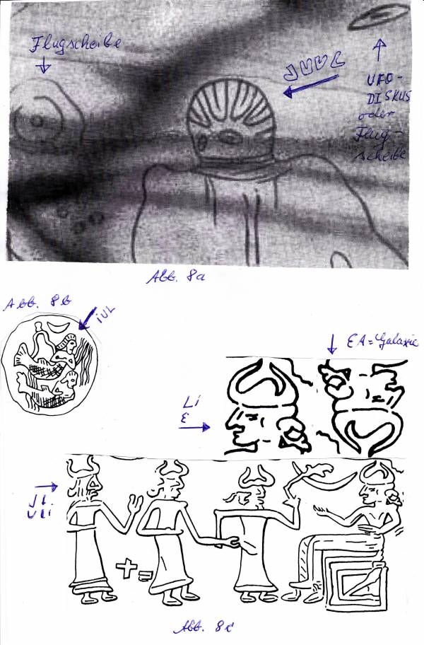 Im Kopf der Frau von Abb. 8b, Rollsiegel aus Lagasch, 2100 vor Null, ist "Jul"